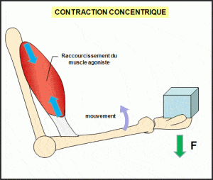 La contraction concentrique est celle au cours de laquelle les muscles se raccourcissent sous l’action de la myosine et de l’actine. Par exemple, la contraction qui se produit sur votre biceps lorsque vous fléchissez votre bras est une contraction concentrique. Cette contraction est dite positive et fait partir des contractions isotoniques.