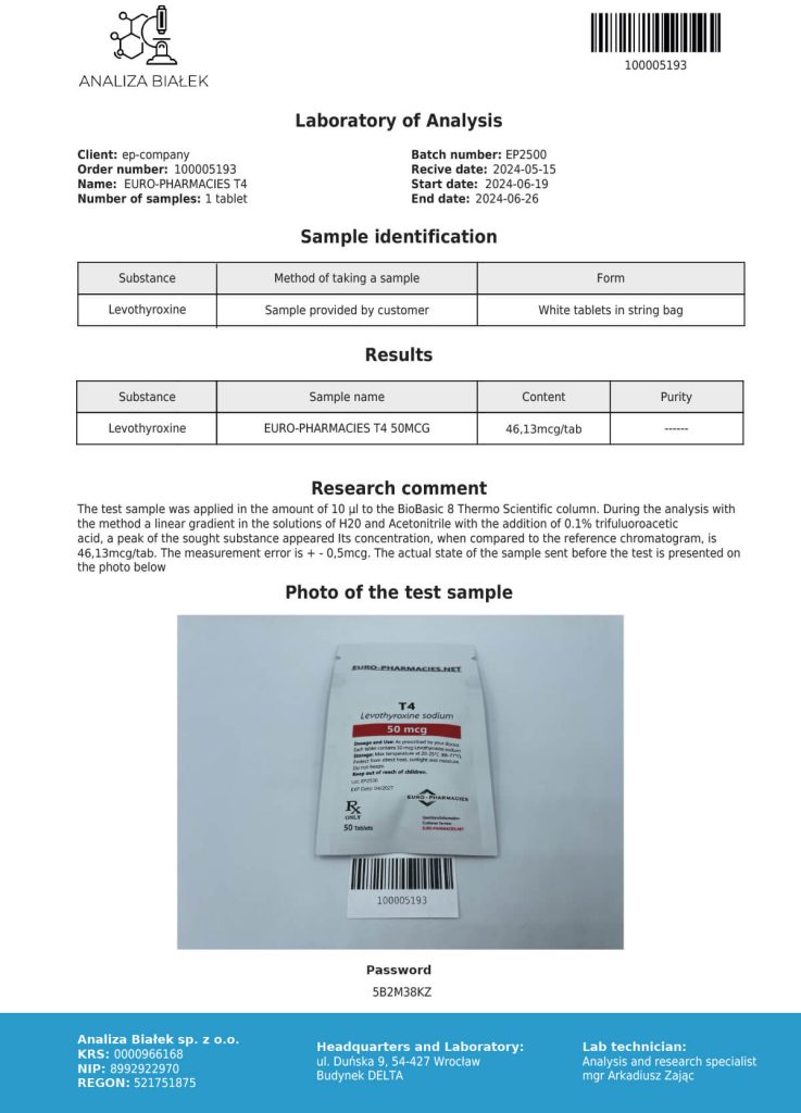 T4 est une hormone thyroïdienne synthétique (Type T-4). Ce produit est généralement disponible en boîte de 100 comprimés à 100 mcgs chacun. Il est disponible dans une variété de doses mais allant de 5 à 100 mcgs par comprimé. La marque Euro Pharmacies propose ici une dose de 50mcg/comp pour 50 comprimés.
