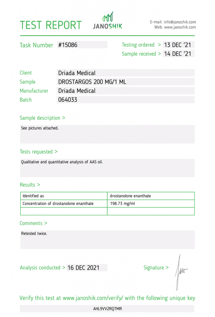 Drostanolone Enanthate est un composé à base de Drostanolone avec un ester énanthate. Drostanolone Enanthate est un dérivé synthétique de la dihydrotestostérone, fournissant un puissant effet androgène qui engendre une augmentation de la densité et de la dureté du muscle. Comme il s’agit d’un dérivé de la dihydrotestostérone, Dromastolone Enanthate ne peut pas être convertie en œstrogènes. Par conséquent, la rétention d’eau liée à l’oestrogène est totalement exclue. C’est un stéroïde anabolisant très efficace.