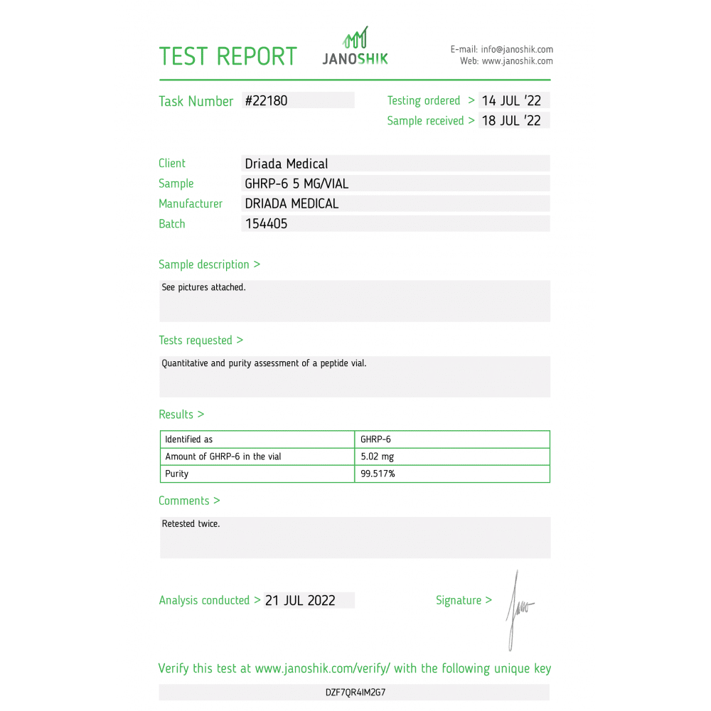Growth Hormone Releasing Peptide (GHRP-6) est un peptide de la famille des peptides secretaguogue de l’hormone de croissance. Il a une forte incidence sur la libération de l’hormone de croissance humaine (HGH) d’une manière spécifique et liée à la dose. GHRP peut être utilisé efficacement dans le traitement de carence d’hormone de croissance (GH). L’hormone de croissance libérant des hexapeptides fonctionne par une signalisation par la glande pituitaire pour commencer la sécrétion d’hormone de croissance.